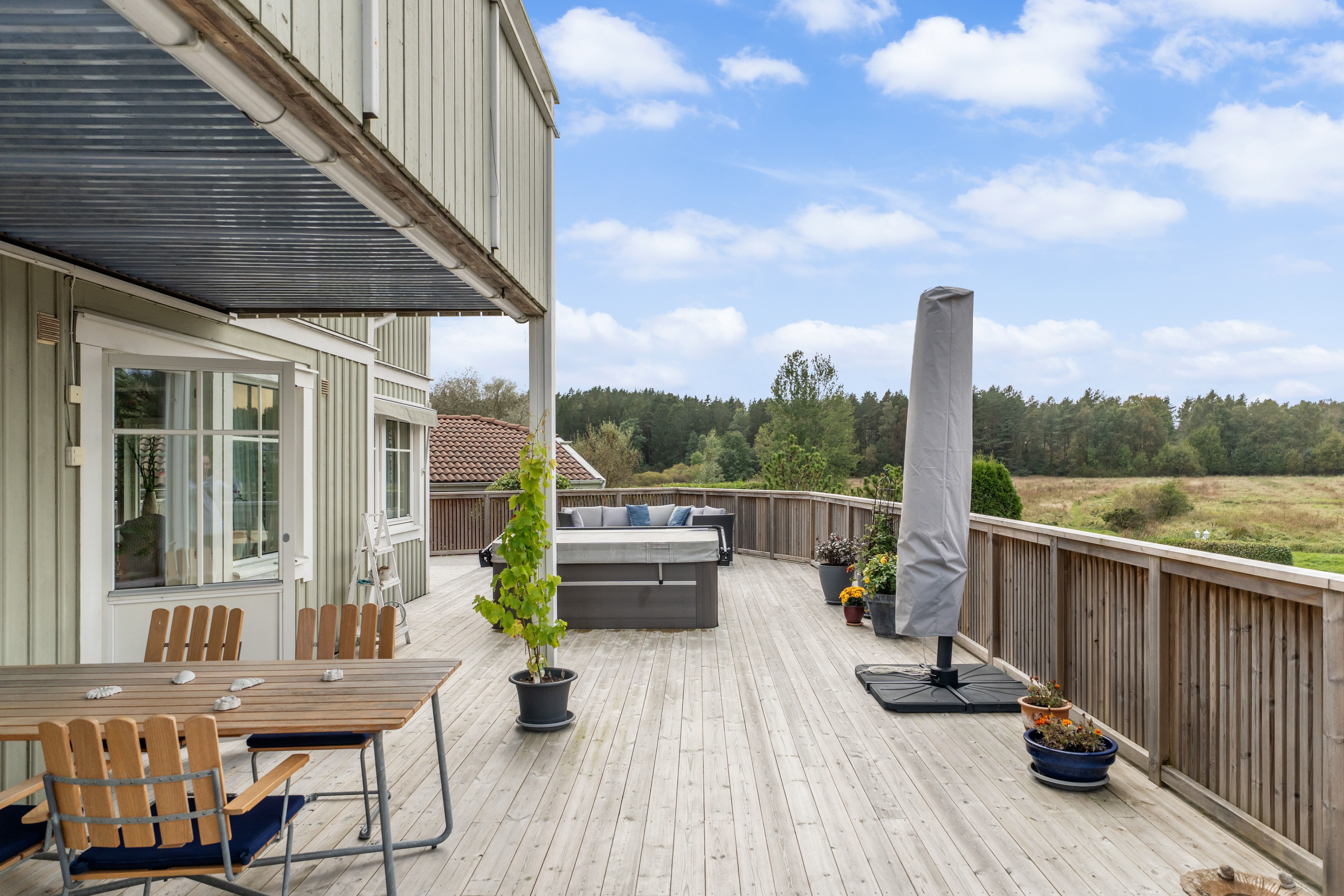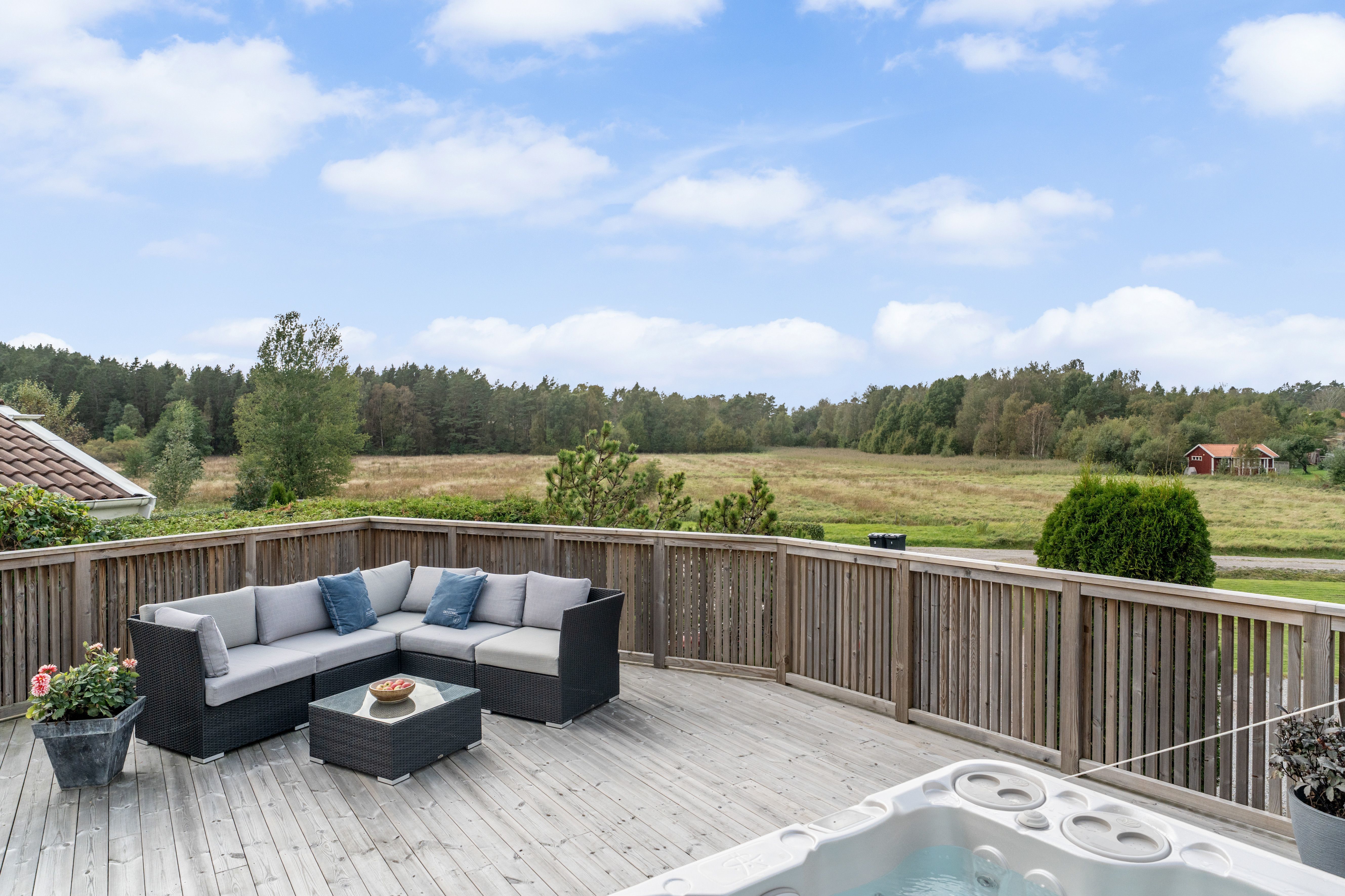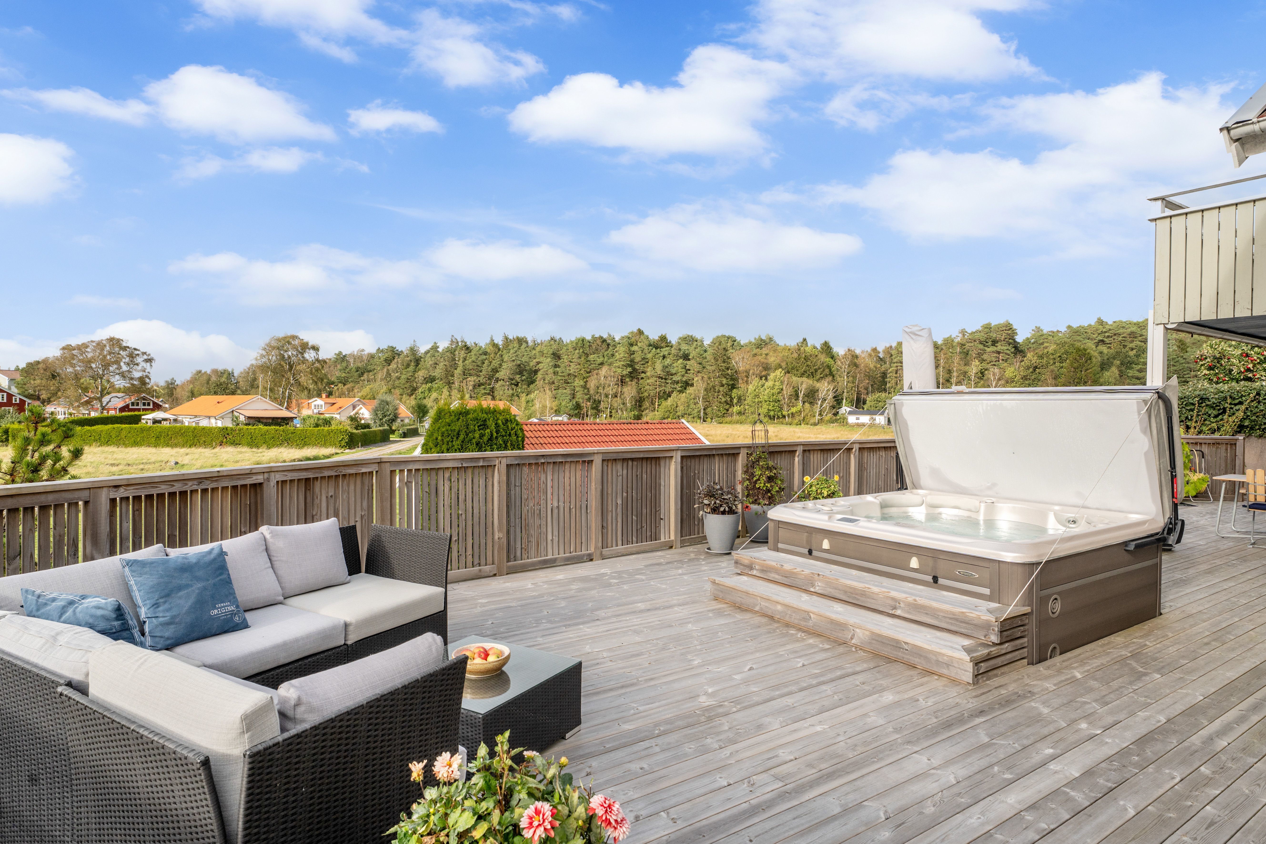 Från vardagsrummet öppnar du upp mot en stor altan i soligt läge, där kvällssolen dröjer sig kvar länge. Här finns gott om plats för loungegrupp, matbord och grill – och som kronan på verket står ett spabad som bjuder in till lyxig avkoppling året runt. Tänk dig att sjunka ner i det varma vattnet en krispig vinterkväll medan stjärnhimlen speglar sig ovanför – ren livskvalitet.