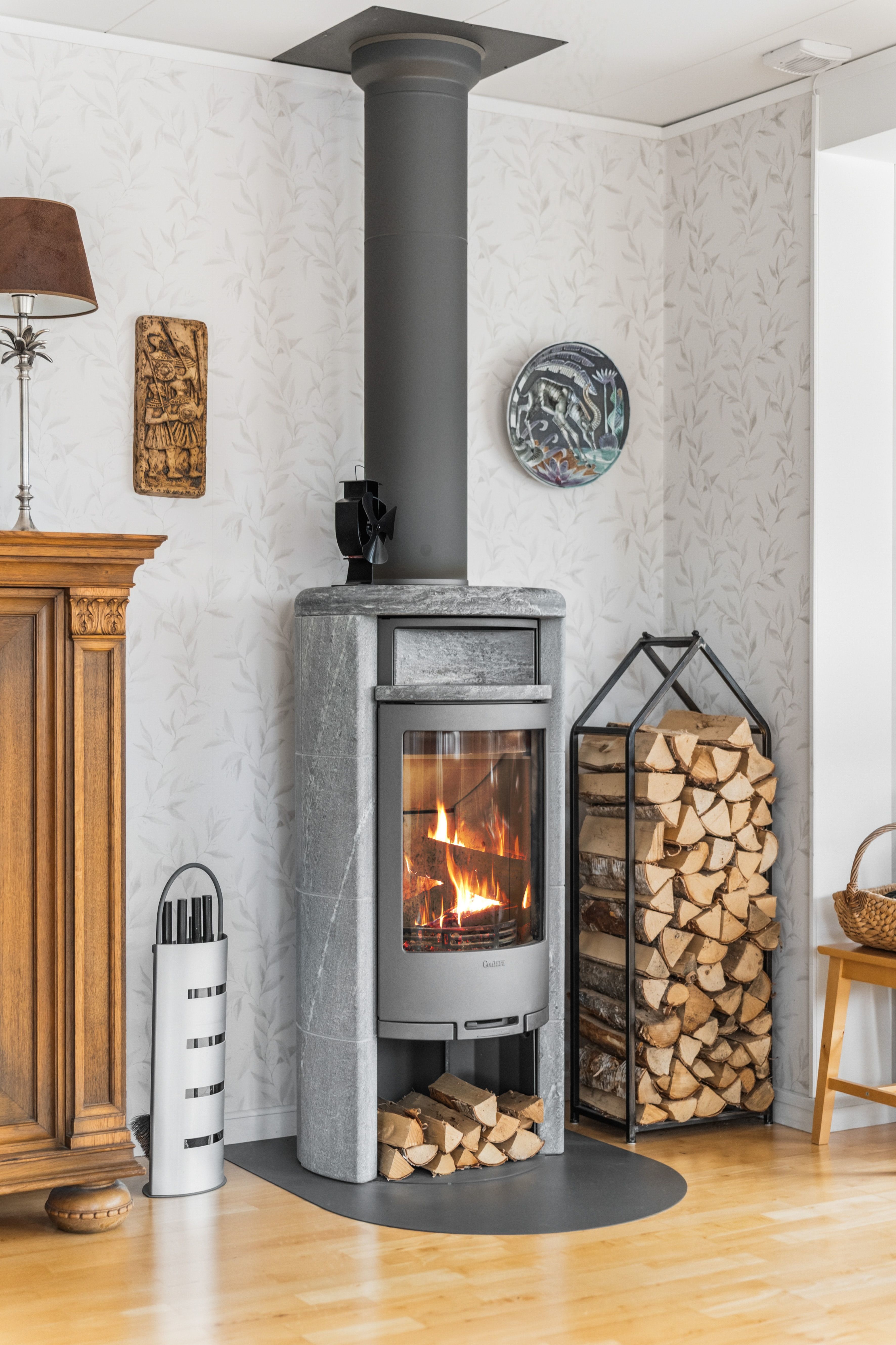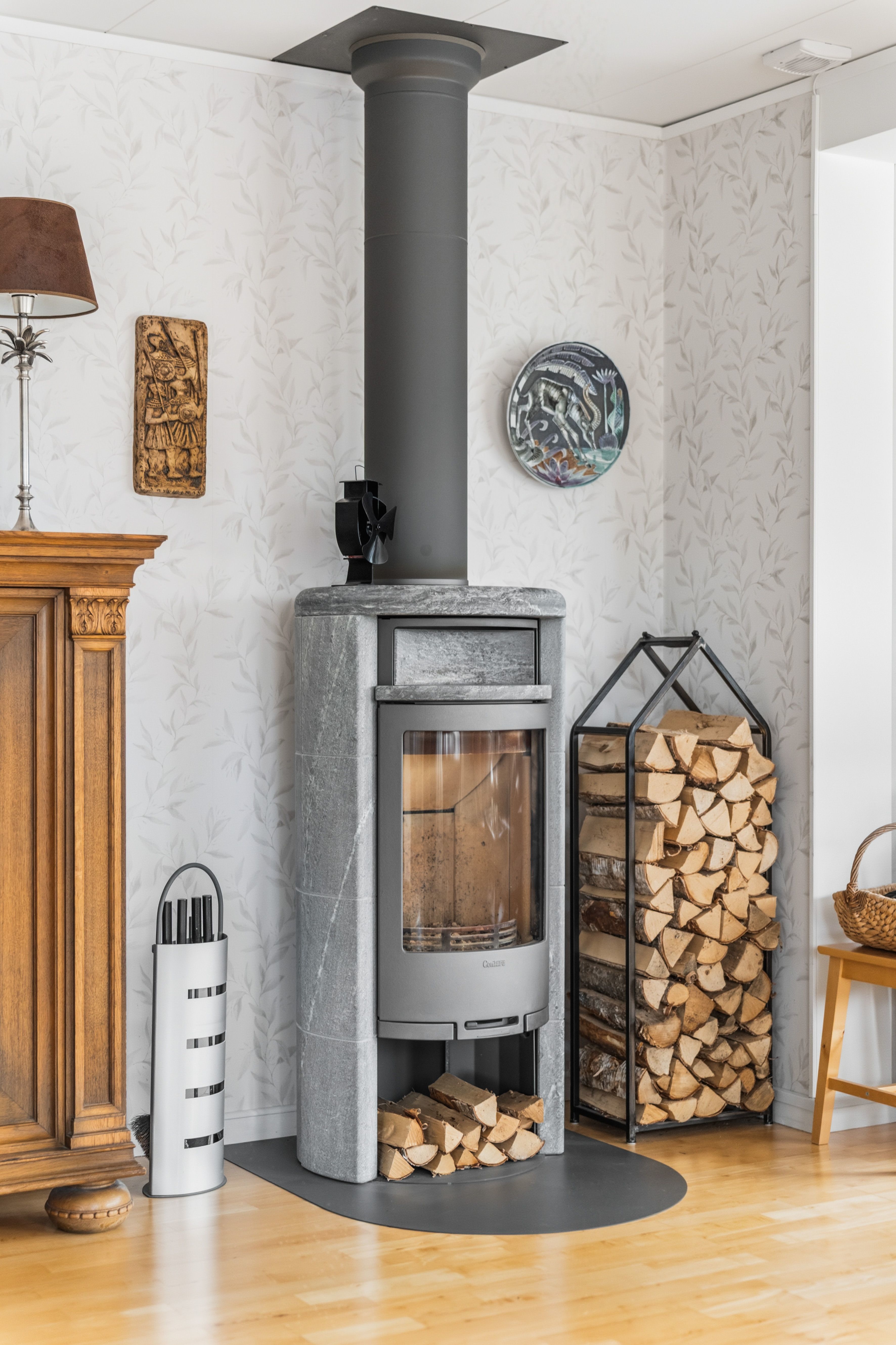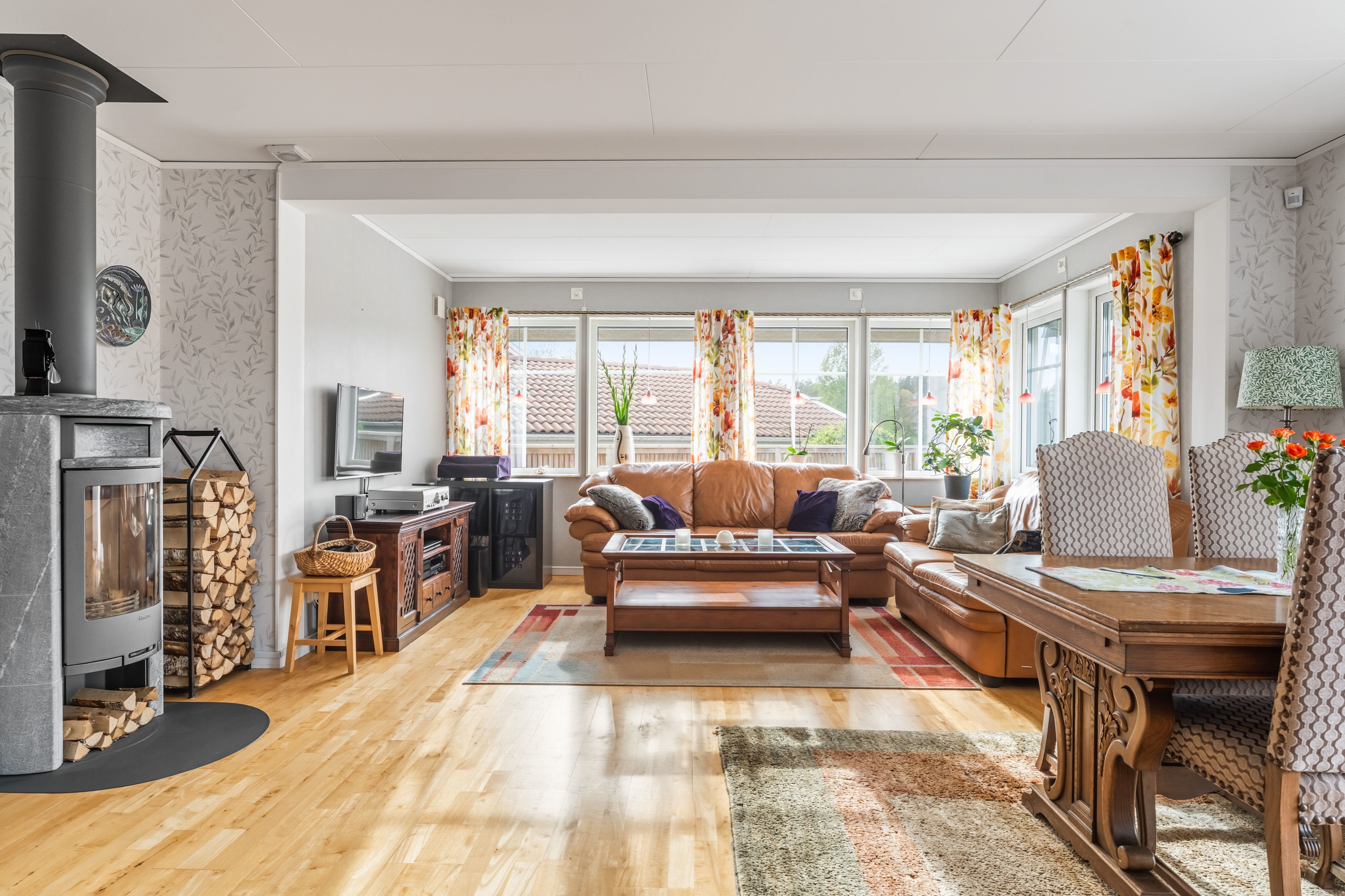 Inne i huset väntar ett rymligt och ljust vardagsrum med vackert ljusinsläpp och en braskamin som blir hemmets naturliga hjärta. Här skapas den där varma, inbjudande känslan som gör att man gärna stannar kvar – perfekt för både familjemys och middagar med vänner.