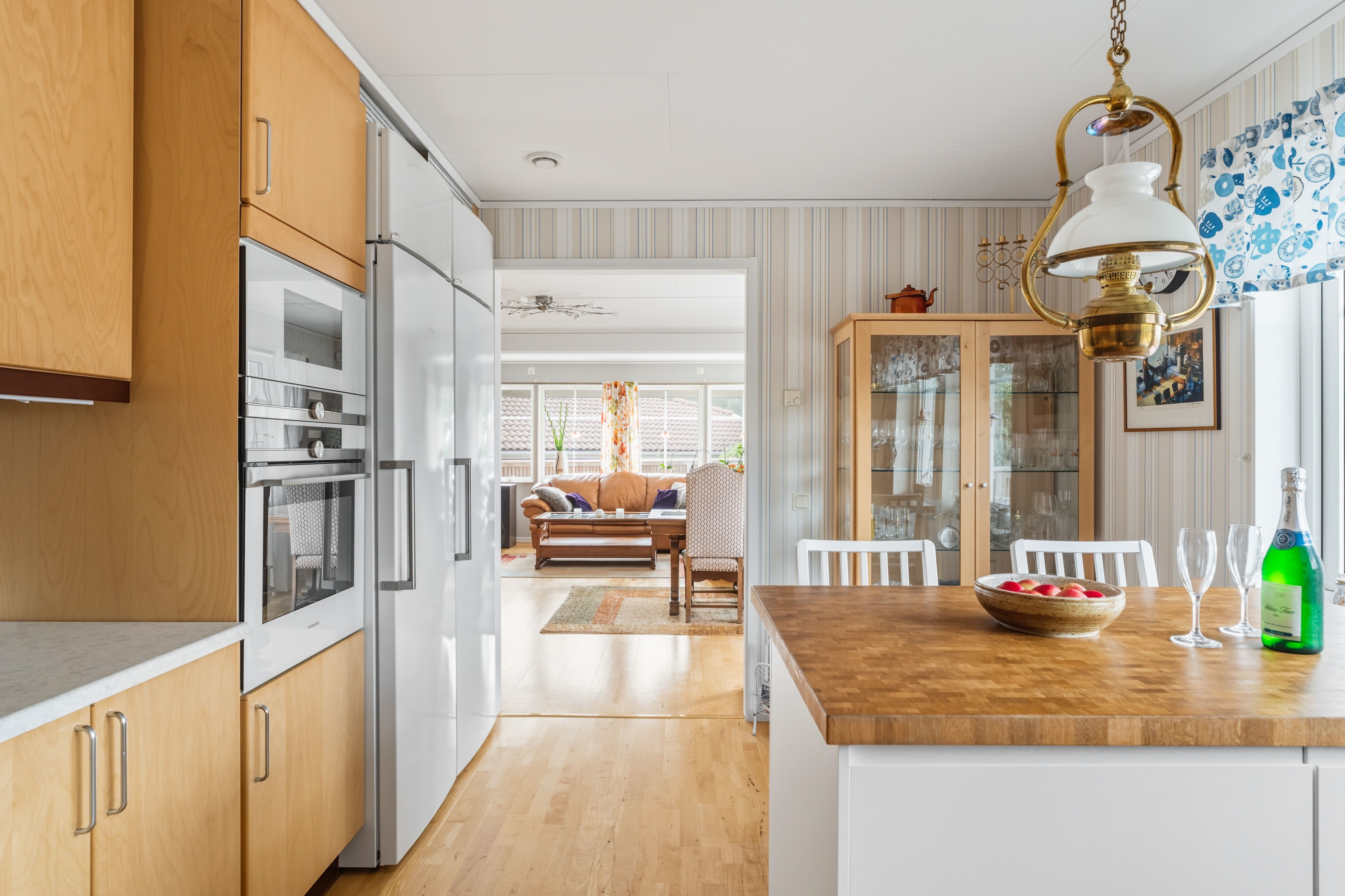 Köket är både funktionellt och inbjudande, med gott om arbetsytor, bra förvaring och plats för stort matbord. Härifrån har du kontakt med både vardagsrum och uteplats, vilket gör det enkelt att umgås. Planlösningen är genomtänkt och flexibel – totalt 6 rum och kök, varav 4–5 sovrum, vilket gör huset idealiskt för barnfamiljen, paret som jobbar hemifrån eller dig som vill ha gästrum och hobbyrum.